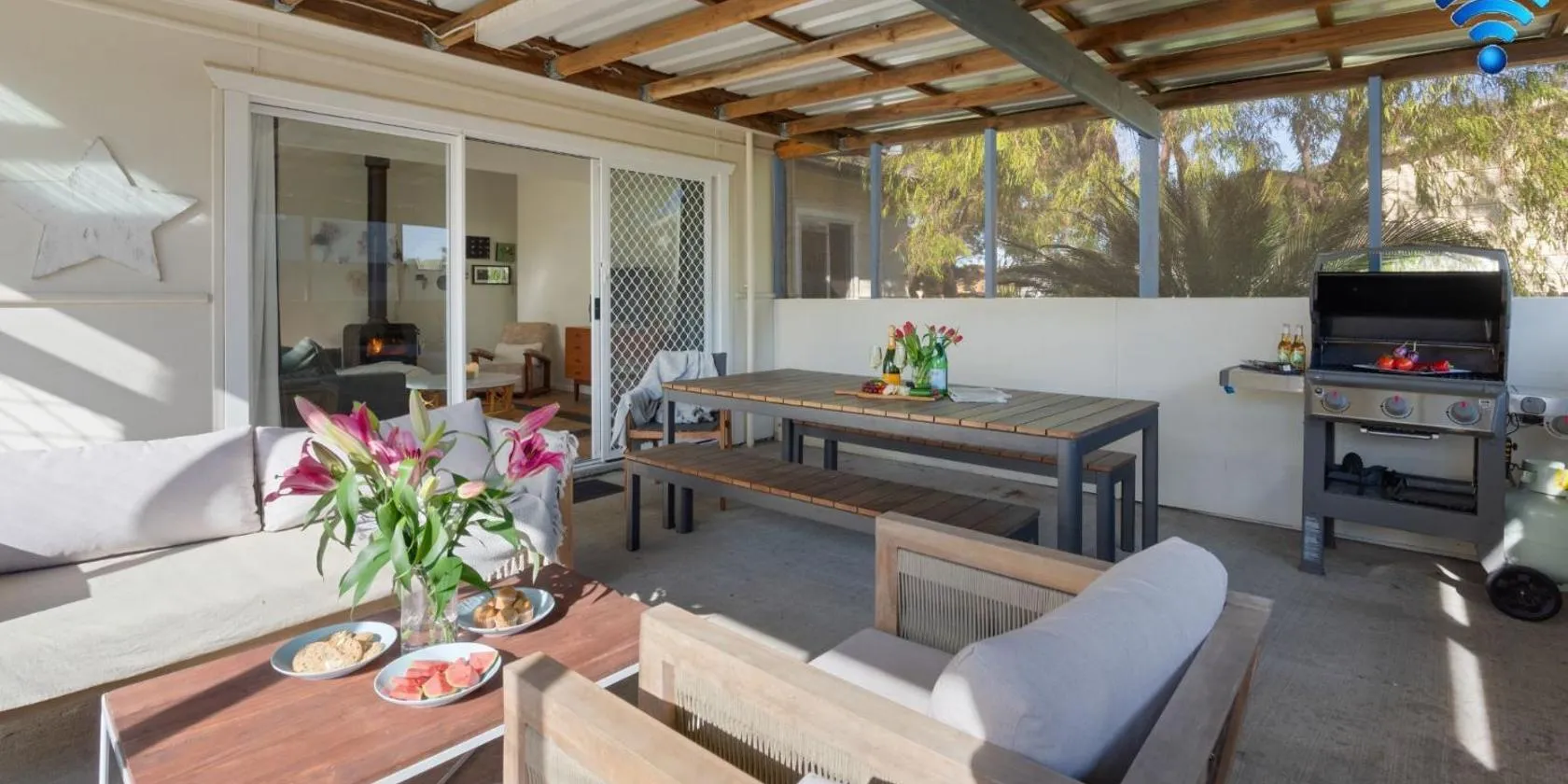 Die Unterkunft Whitewash I Pet Friendly I 5 Mins Walk to Beach besticht durch Gartenblick und Übernachtungsmöglichkeiten mit einer Terrasse und einer Kaffeemaschine, ungefähr 700 m von Strand Callala...