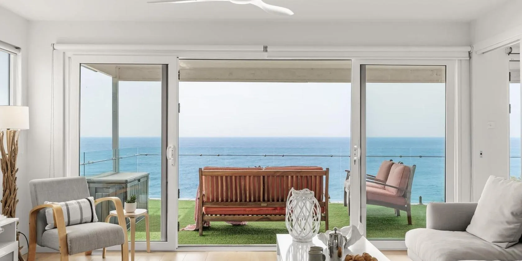 Die Unterkunft Ocean Overlook - Rennies Beach holiday haven verfügt über Meerblick und Übernachtungsmöglichkeiten mit einer Veranda / Patio und einem Wasserkocher, ungefähr 20 m von Strand Rennies...