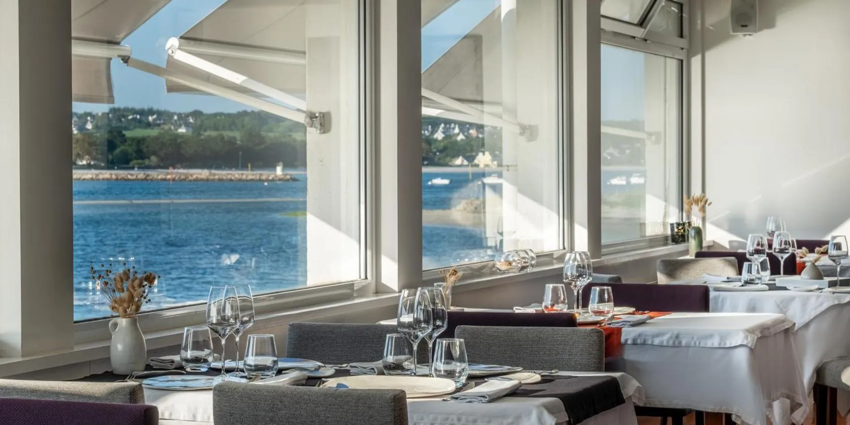 Mit Blick auf den Strand bietet die Unterkunft Logis Hôtel de la Pointe du Cap Coz mit 3 Sternen Übernachtungsmöglichkeiten in Fouesnant und bietet eine Gemeinschaftslounge, eine Terrasse und ein...