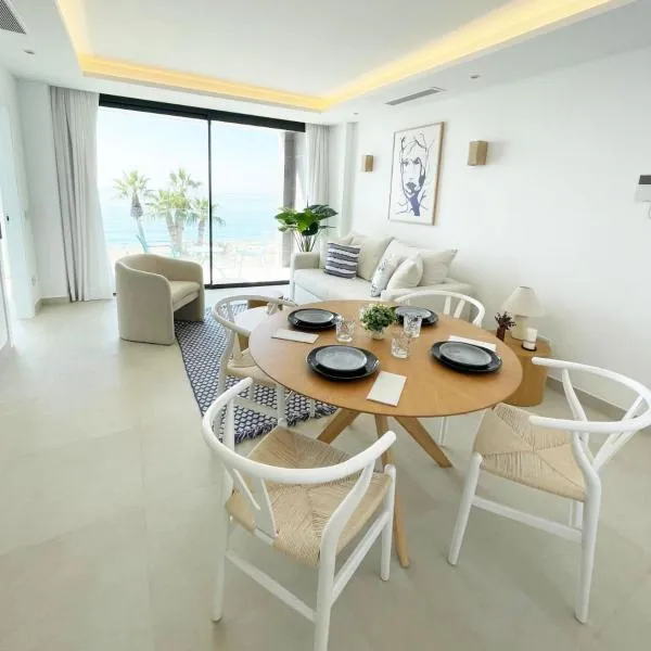 Die Unterkunft Beachfront Design LUX Studio Apartment, die über einen Garten, einen eigenen Strandbereich und eine Bar verfügt, bietet Übernachtungsmöglichkeiten in Estepona mit kostenlosem WLAN und...