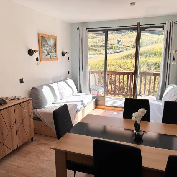Die Unterkunft Appartement Valmeinier 4 à 5 personnes Résidence LAGRANGE verfügt über Bergblick und Übernachtungsmöglichkeiten mit einer Terrasse und einer Kaffeemaschine, ungefähr 40 km von Les...