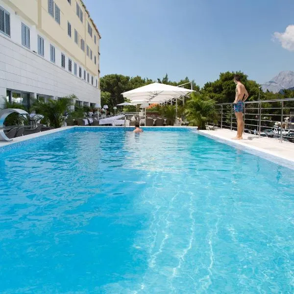 Direkt am Strand bietet das Hotel Park Makarska einen Außenpool, eine Sonnenterrasse sowie ein À-la-carte-Restaurant, das internationale Gerichte serviert.