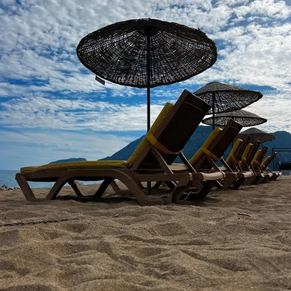 Die Unterkunft Tahtavilla Pansiyon mit Bergblick in Çıralı bietet Übernachtungsmöglichkeiten mit einem Garten, einem eigenen Strandbereich und einer Terrasse.