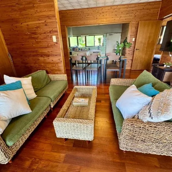 A comfortable freestanding townhouse in Motobu, Churaumi Village can be rented for private use. It features a garden with outdoor furniture and barbecue facilities, free Wi-Fi and free parking.