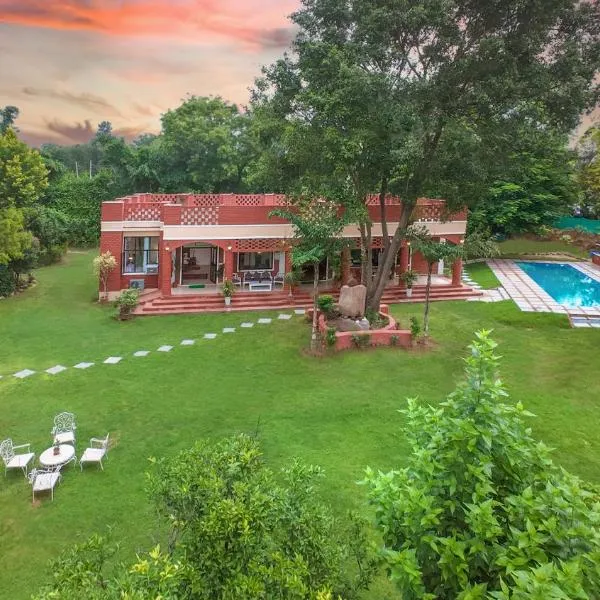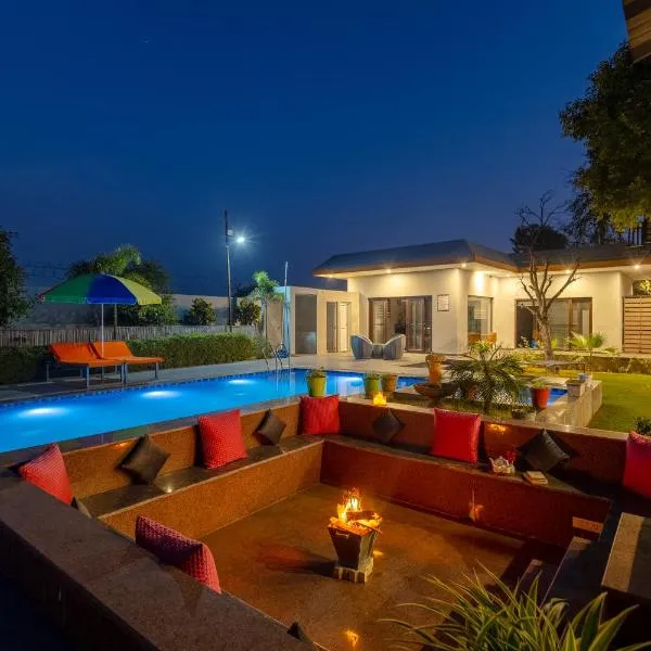 Proposant une piscine, un jardin, un bar et connexion Wi-Fi gratuite, l’établissement StayVista at Maple Farms with Pool, BBQ & Bonfire se situe à Sohna et offre une vue sur la piscine.